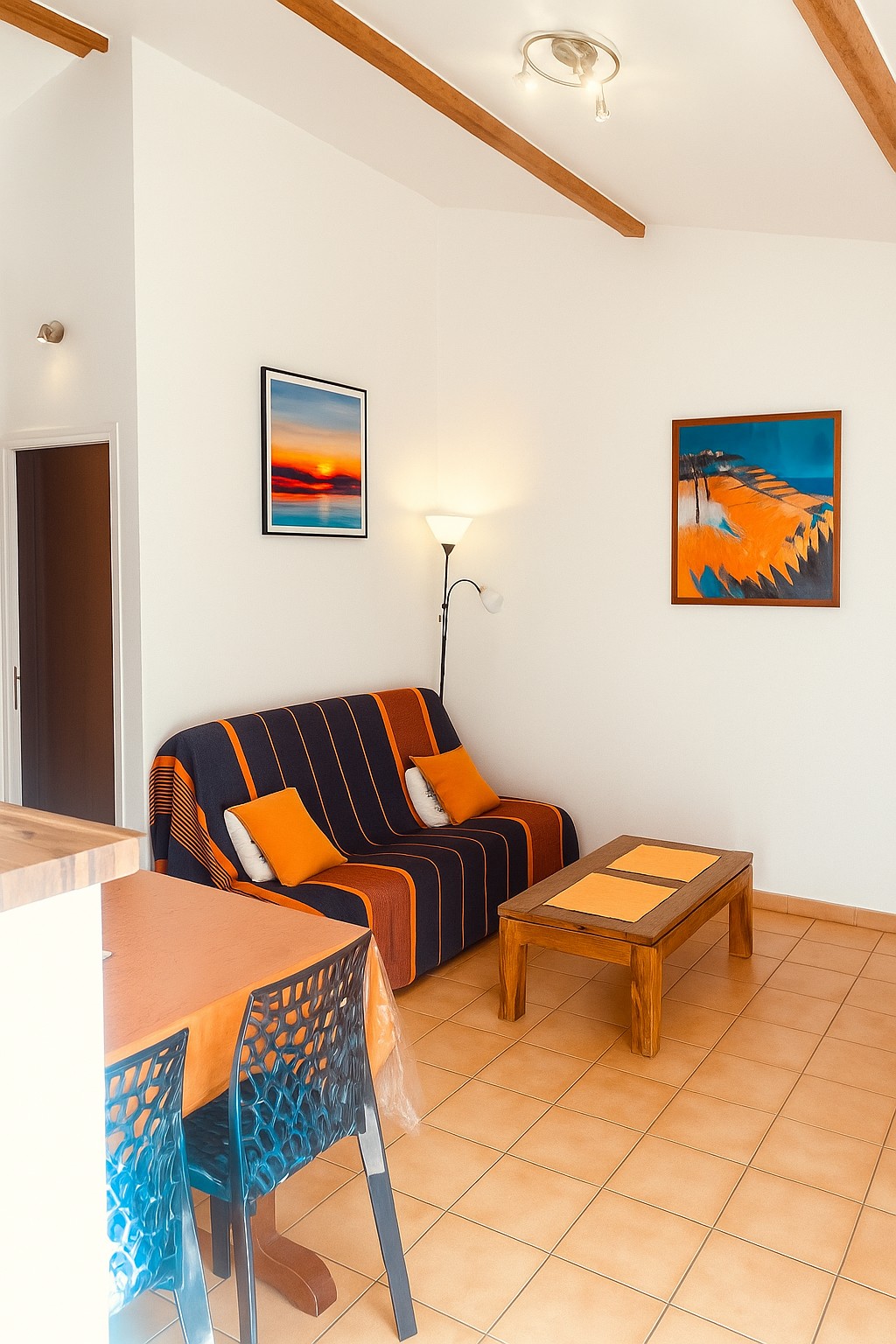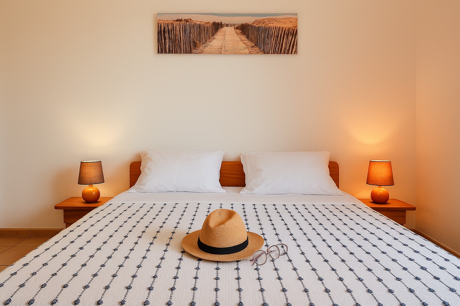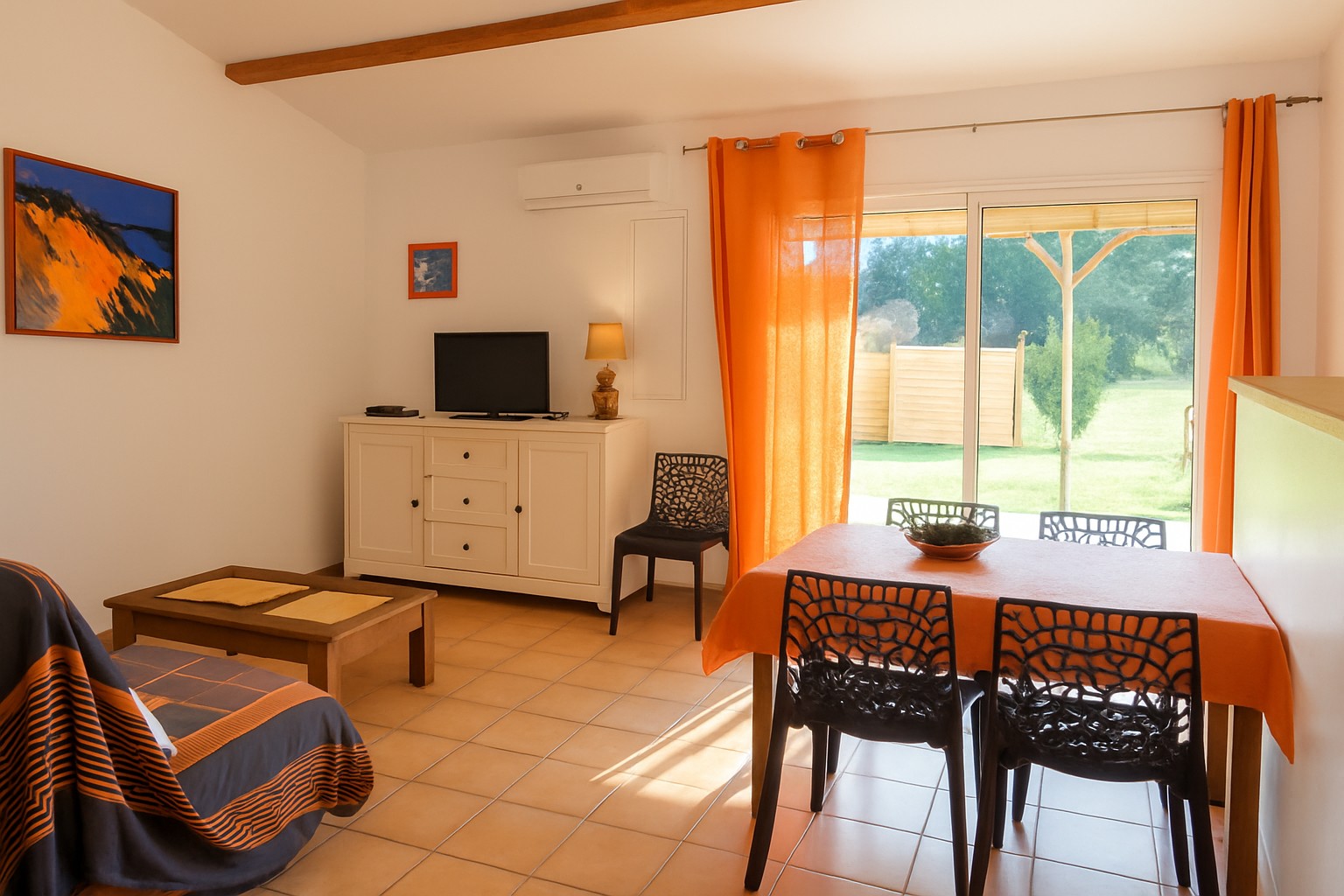 Ce logement de deux chambres est équipé de la climatisation, d’un accès wifi et d’une grande terrasse couverte (pergola) sans vis-à-vis direct avec salon de jardin, chaises longues et barbecue individuel. L'hébergement comporte une chambre avec un lit double et une autre chambre avec 2 lits en 80 (jumelage possible pour un couchage en 160) + un lit mezzanine en 90, Salle d'eau avec une grande douche et porte en verre, sèche-cheveux et WC séparés. Salon/salle à manger avec canapé clic clac équipé d’un couchage neuf en 130, TV LCD de 80 cm, Cuisine entièrement équipée avec lave-vaisselle, réfrigérateur (plus compartiment congélateur), plaque vitrocéramiques, hotte, mini four, micro-onde, cafetière, grille-pain et bouilloire. Vous disposez d’une buanderie commune avec un lave-linge individuel, aspirateur, produits d'entretien, fer et table à repasser. De plus vous avez accès au parties communes du jardin avec hamacs, Ping-Pong, Badminton.