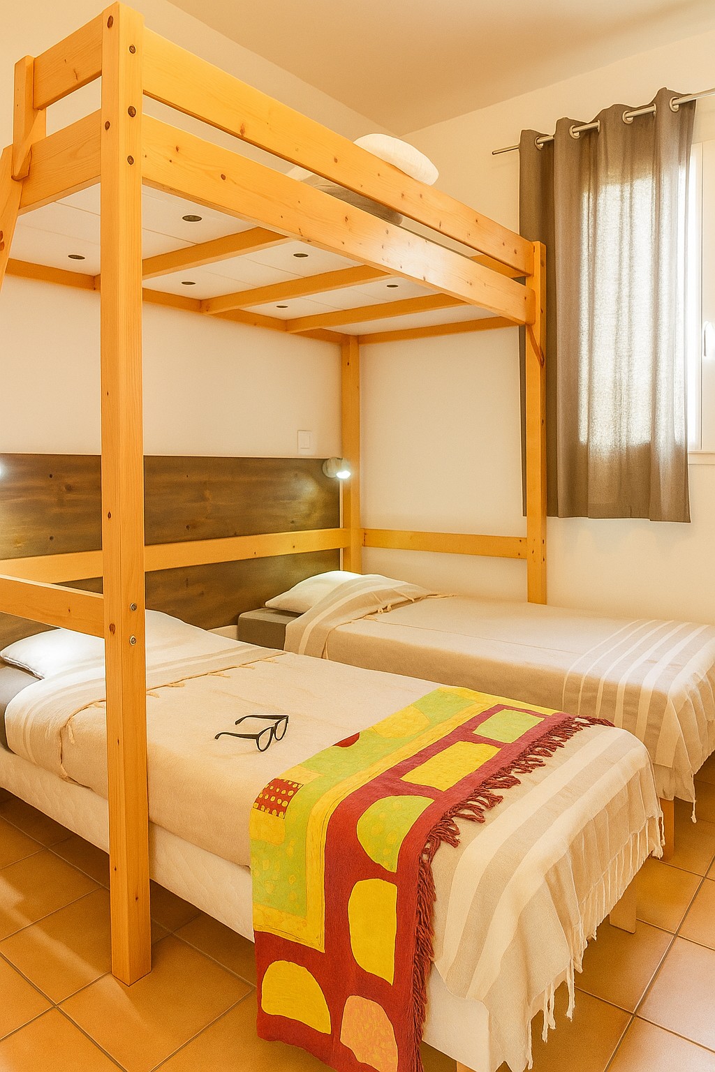 une autre chambre avec 2 lits en 80 (jumelage possible pour un couchage en 160) + un lit mezzanine en 90
