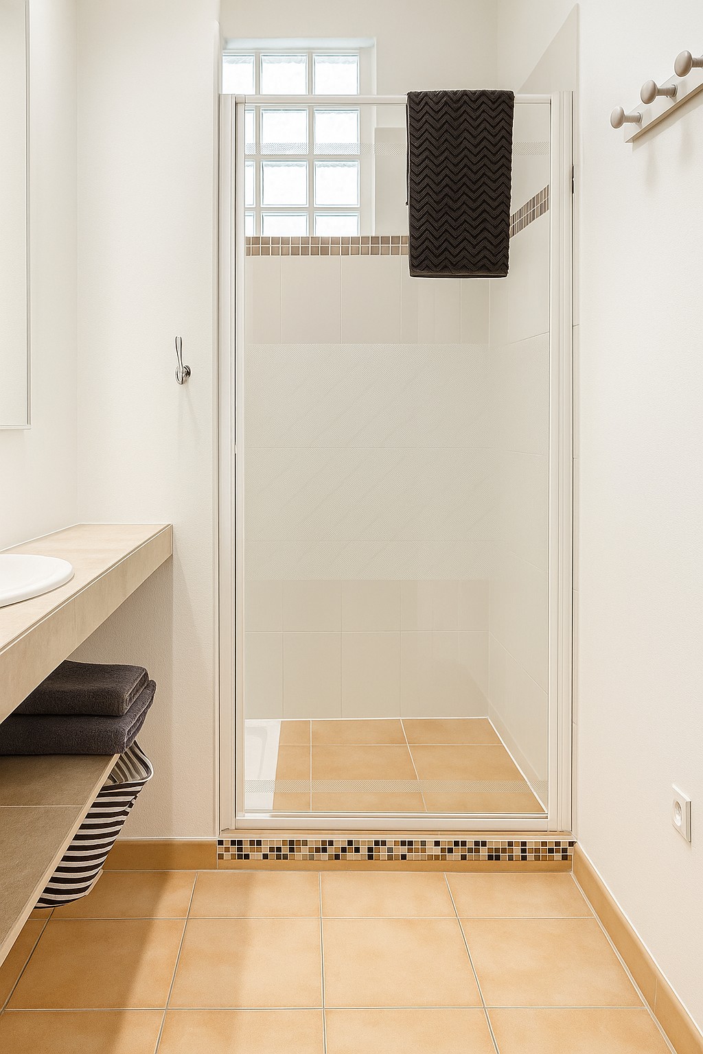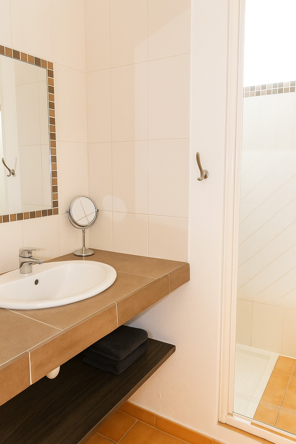 grande douche avec porte en verre, sèche-cheveux. WC indépendant. Vous disposez d'une buanderie avec lave-linge, aspirateurs, produits d'entretien, fer et table à repasser.